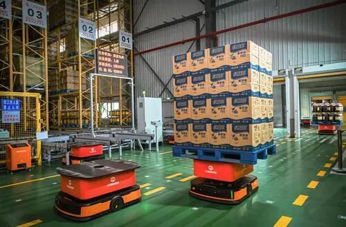 走进灌装车间,眼前的场景充满科技感。一个个油瓶顺着传送带移动,喷码、装箱一气呵成,机械臂稳稳将装箱的油品托举到托盘上,随后AGV(自动运输)小车自动接力,将货物送进库房。整个流程里,只有几名工人在旁观察设备运行情况。