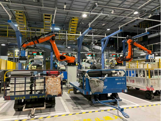 机械臂自动行李分拣、智能回筐、全流程追踪系统同步投用,每小时处理能力超万件,旅客可通过手机实时查看行李轨迹,打消出行顾虑;